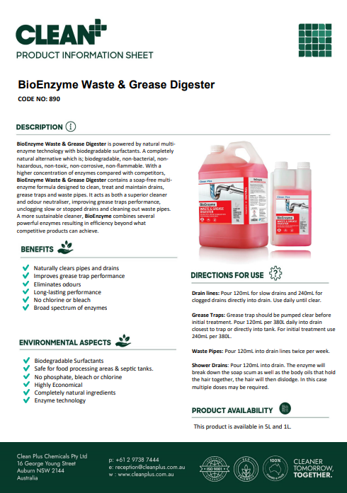 Designed to clean, treat and maintain drains, grease traps and waste pipes. It acts as both a superior cleaner and odour neutraliser, improving grease traps performance, unclogging slow or stopped drains and cleaning out waste pipes. Long lasting performance as enzymes continue to work. Available in 5L and 1L.