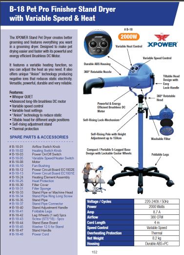 Introducing the new and revolutionary XPOWER Stand Pet Dryer, especially designed to make pet drying easier and faster with its powerful and energy efficient “Brushless DC Motor.” You won’t find a more cost-effective, trouble-free dryer, anywhere - virtually maintenance-free! The XPOWER Stand Pet Dryer creates better grooming and features everything you want in a grooming dryer.