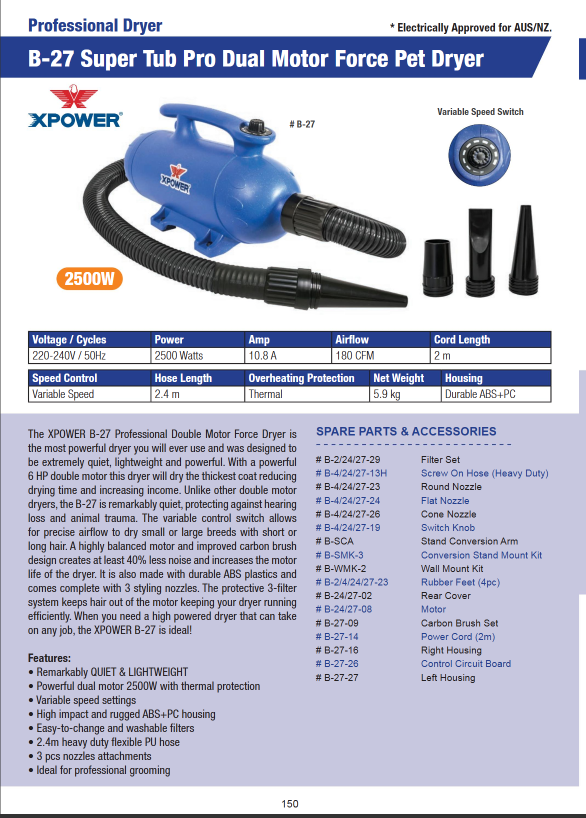 The Control Circuit Board suitable for the B-27 Pet Dryer is a high-quality electronic spare part designed to bring your B-27 grooming dryer back to full working order when the original board fails or becomes unstable. This board manages essential functions - from motor speed regulation, fan control, heating, and on/off controls - ensuring that your dryer operates smoothly and safely. Faulty or worn circuit boards can cause inconsistent airflow, unstable heating, or complete failure of the dryer. Replacing it with this replacement board reinstates reliable operation and restores the dryer’s full functionality. It’s an ideal solution for pet grooming professionals, salons, or pet owners who rely on the B-27 dryer for regular use. By installing this spare part, you avoid the expense of replacing the entire unit while extending its lifespan and maintaining safe, dependable performance.