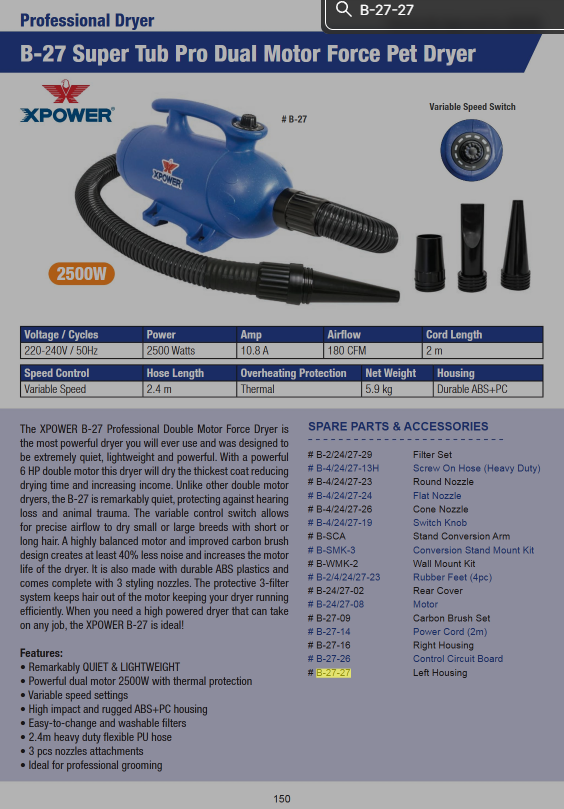The Left Housing (Injection Mold) to suit B‑27 is a precision‑manufactured replacement shell designed to restore the structural integrity and protective enclosure of your B‑27 Pet Dryer. This left‑side housing encloses and safeguards the internal components - motor, wiring, heating element and airflow system - providing a stable, insulated, and properly aligned outer casing. Over time, housings can crack, wear, or degrade due to heat, impact, or prolonged use; replacing the housing ensures the dryer remains safe to operate, protects sensitive internal parts, and prevents dust, moisture or debris from causing malfunctions. The housing is molded to match original specifications and dimensions, ensuring proper fit and airflow alignment. Whether you’re refurbishing a salon dryer or performing maintenance at home, this replacement housing is a cost‑effective way to extend the life of your B‑27 dryer and maintain its reliability for regular grooming use. .