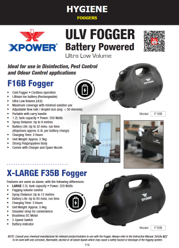 The XPOWER F16B Ultra Low Volume (ULV) Cold Fogger is a battery powered (cordless) and rechargeable cold fogging machine that uses large volumes of air at low pressure to transform liquid into droplets that are dispersed into the atmosphere. It can be used to disinfect large and often hard to reach areas in a very short time.
