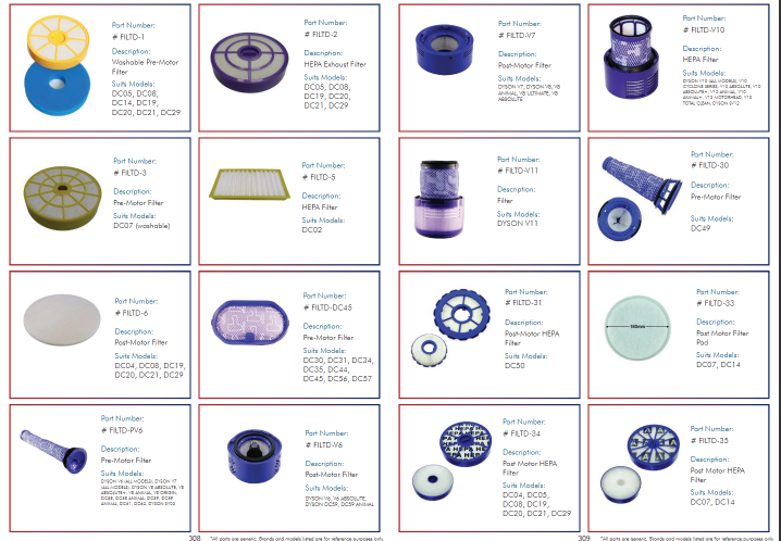 - Dyson DC30, DC31, DC34, DC35, DC44, DC45, DC56, DC57 models