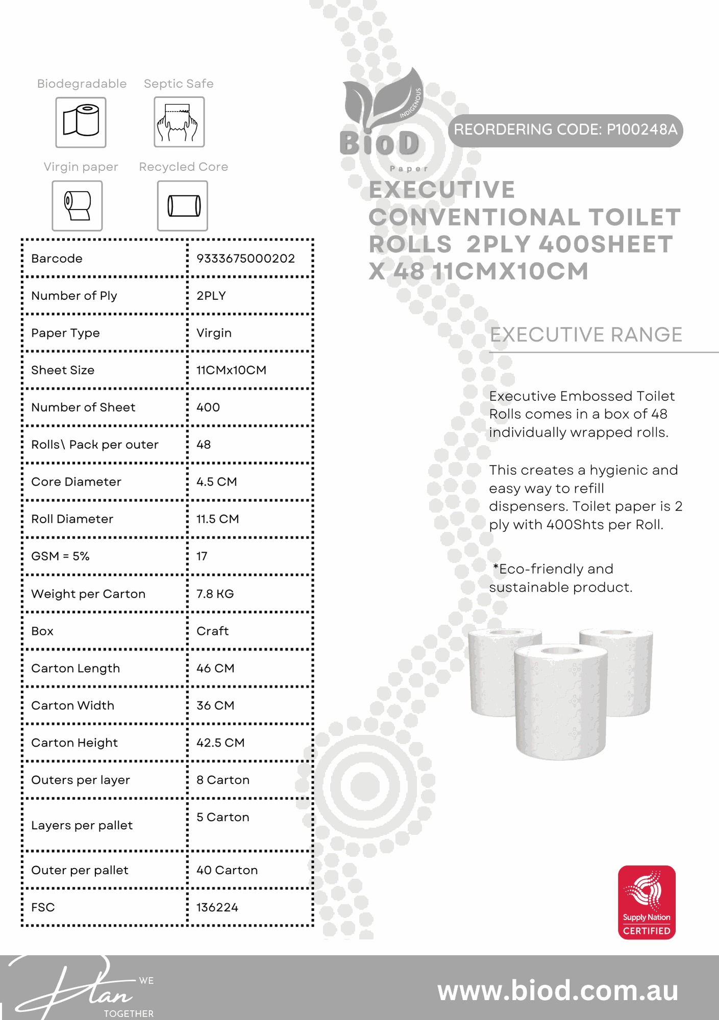 (INDIGENOUS OWNED) BIOD - EXECUTIVE CONVENTIONAL TOILET ROLLS 2PLY 400SHEET X 48 11CMX10CM