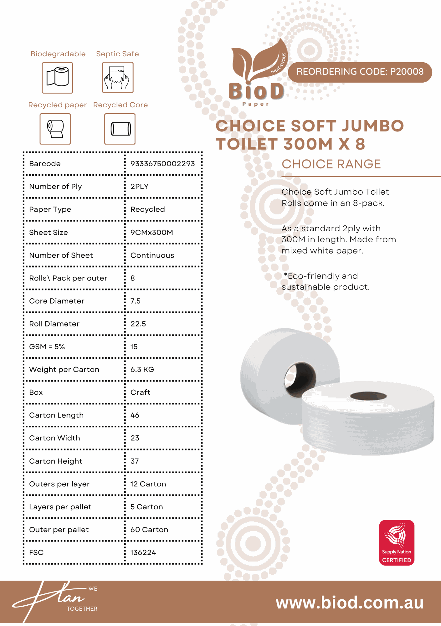 (INDIGENOUS OWNED) BIOD-CHOICE SOFT JUMBO TOILET 300M X 8