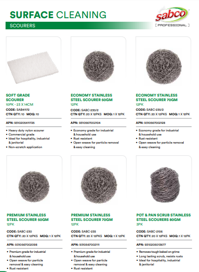 Sabco Professional offers a comprehensive range of high-quality products for commercial and professional use. Our dedication to excellence is evident, in particular in our scourers range, featuring the innovative Premium Stainless Steel Scourer. This dedication ensures durability, reliability, and exceptional performance.