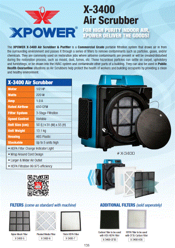 The XPOWER X-3400 HEPA Filtered Air Purifier Scrubber is a portable filtration system that draws air in from the surrounding environment and passes it through a series of filters to remove airborne contaminants such as particles, gases, chemicals, allergens, pollens, bacteria, mould, fumes, dust and more. They are commonly used on restoration jobs where airborne contaminants are present or will be created/disturbed during the restoration process, such as mould, dust, fumes, etc. These hazardous particles can settle on carpet, upholstery and furnishings, or be drawn into the HVAC system and contaminate other parts of a building.